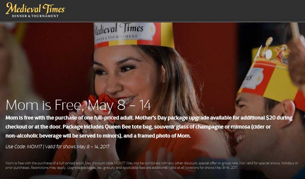 Mom is free with your ticket the 8-14th at Medieval Times dinner & tournament