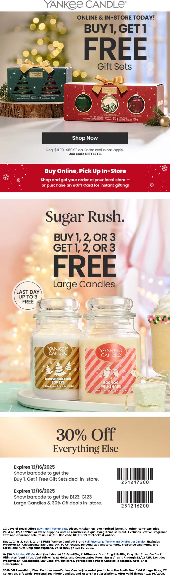 Second gift set or large candle free + 30% off everything else today at Yankee Candle, or online via promo code GIFTSETS