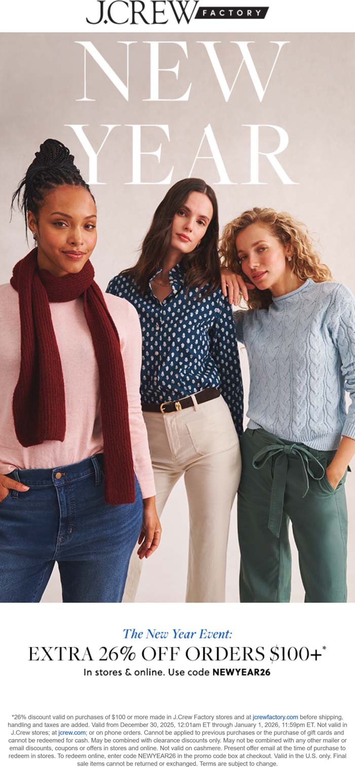 26% off $100+ at J.Crew Factory, or online via promo code NEWYEAR26