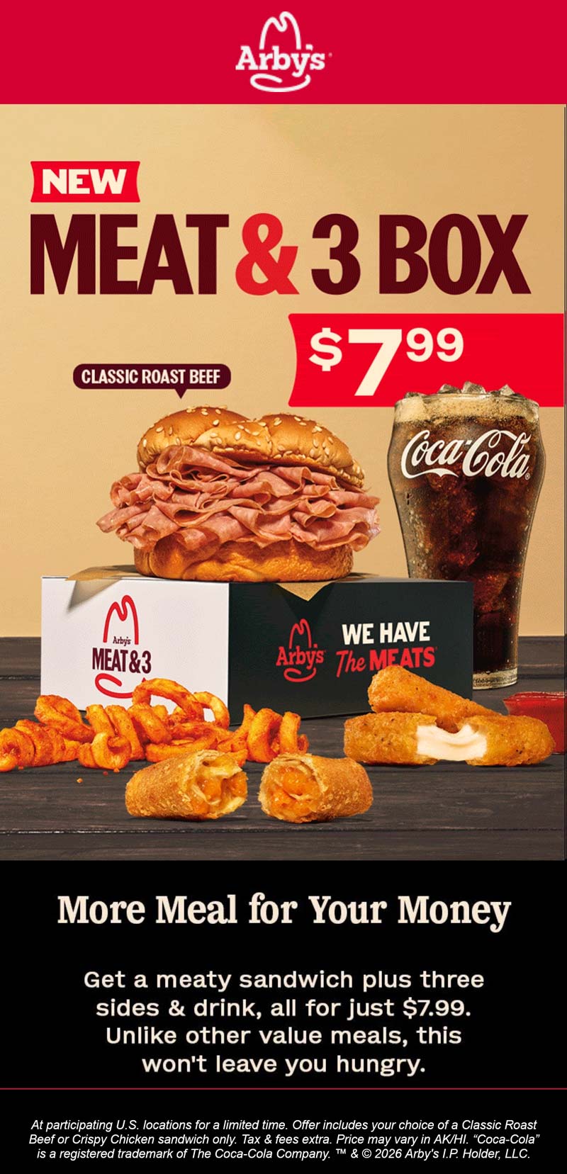 Beef or chicken sandwich + 3 sides + drink = $8 at Arbys