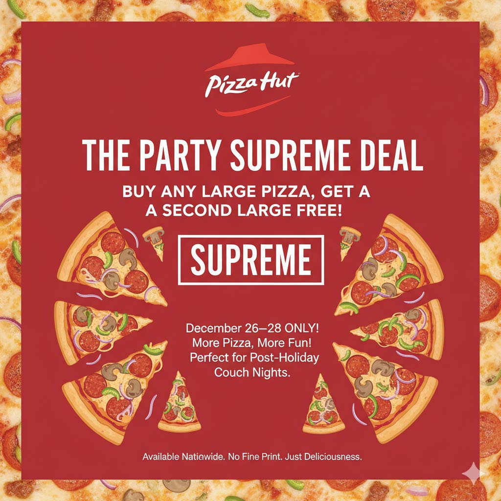 Second large pizza free 26-28th at Pizza Hut via promo code SUPREME