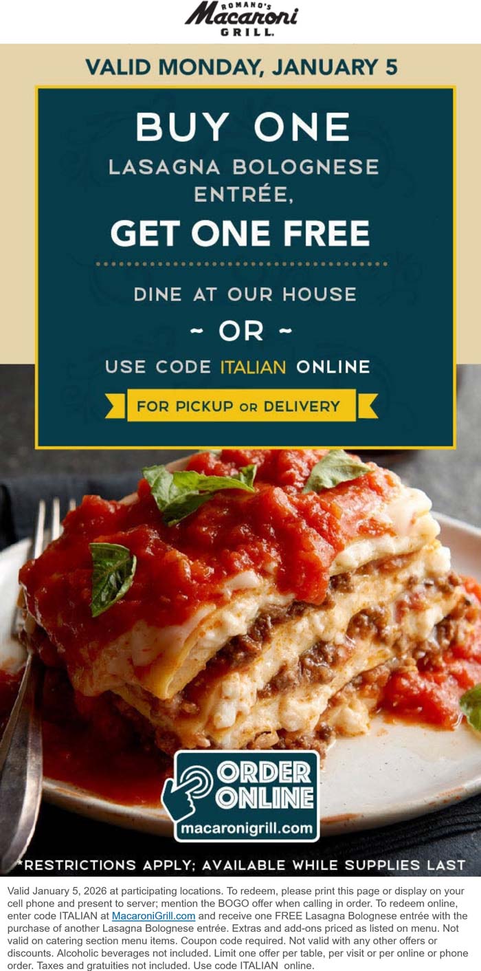 Second lasagna entree free today at Macaroni Grill, or online via promo code ITALIAN
