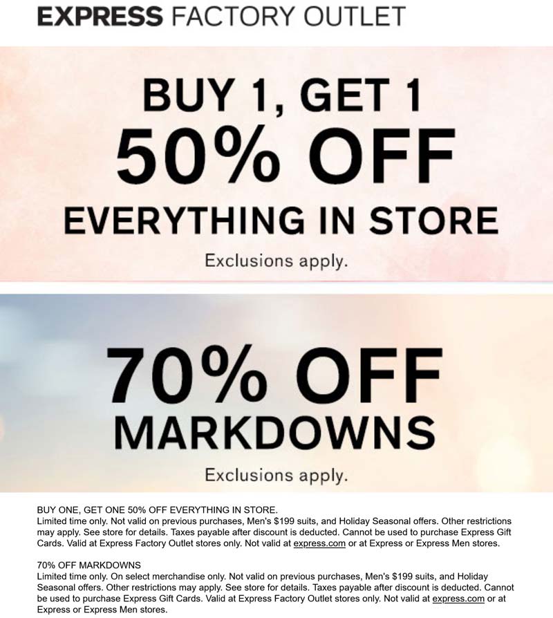 Second item 50% off + extra 70% off sale items at Express Factory Outlet