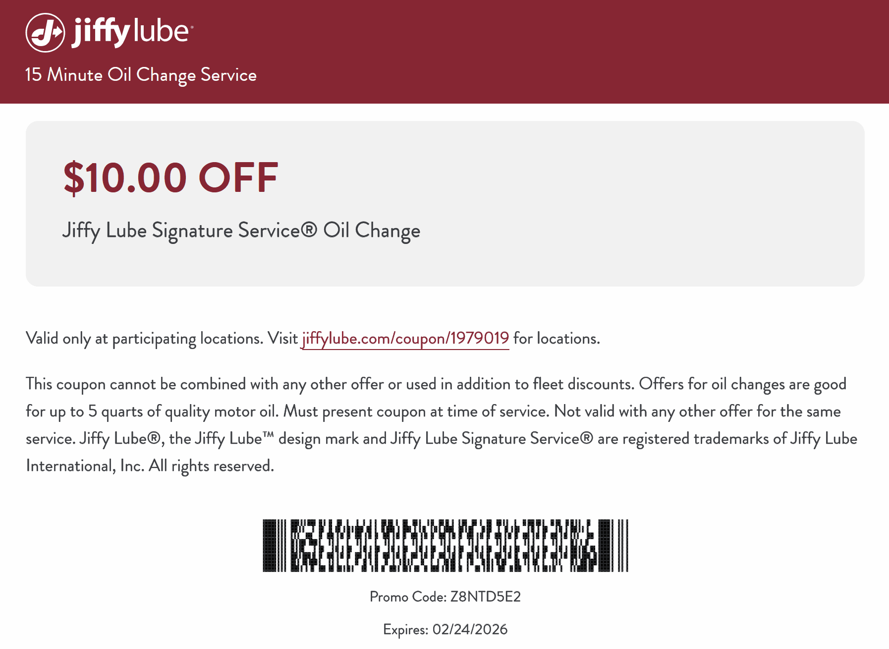 Jiffy Lube Coupons & Promo Codes for January 2026