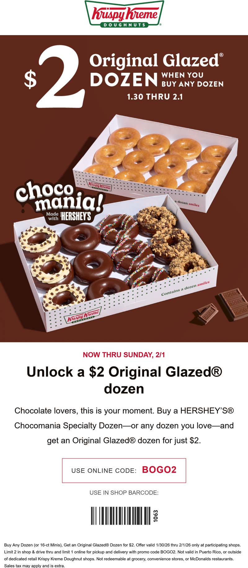Second dozen doughnuts for $2 at Krispy Kreme, or online via promo code BOGO2