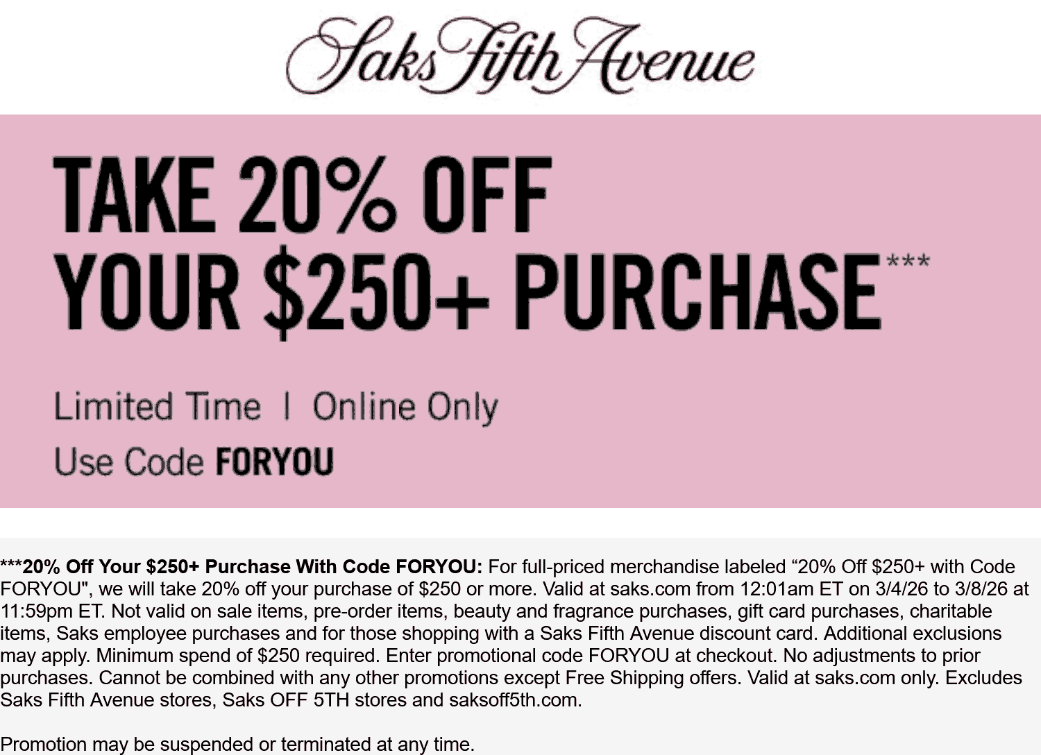 20% off $250+ at Saks Fifth Avenue via promo code FORYOU