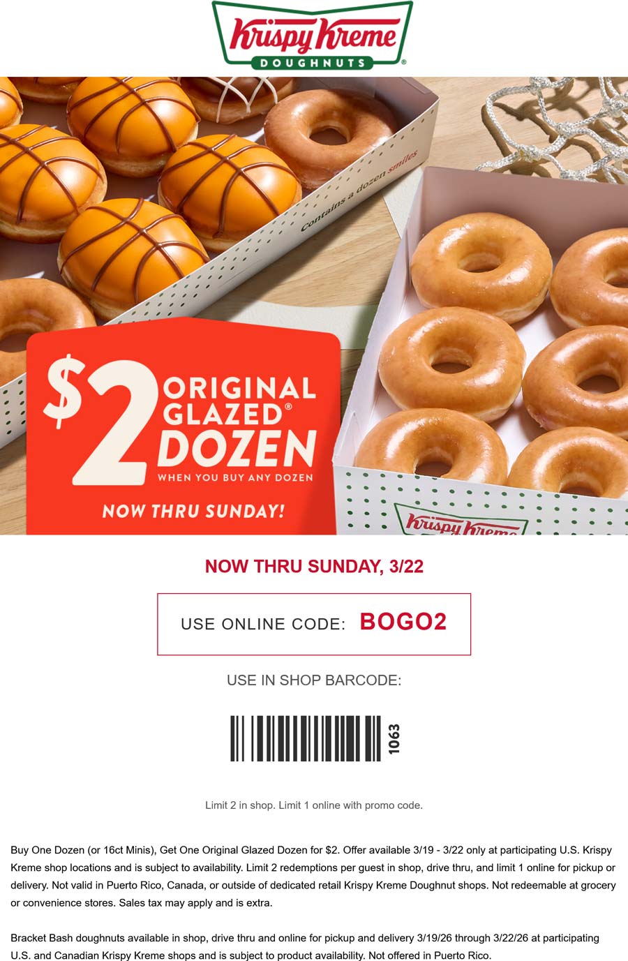 Second dozen doughnuts = $2 at Krispy Kreme, or online via promo code BOGO2