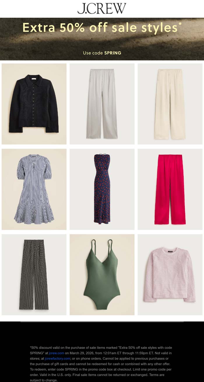 Extra 50% off sale styles today at J.Crew via promo code SPRING