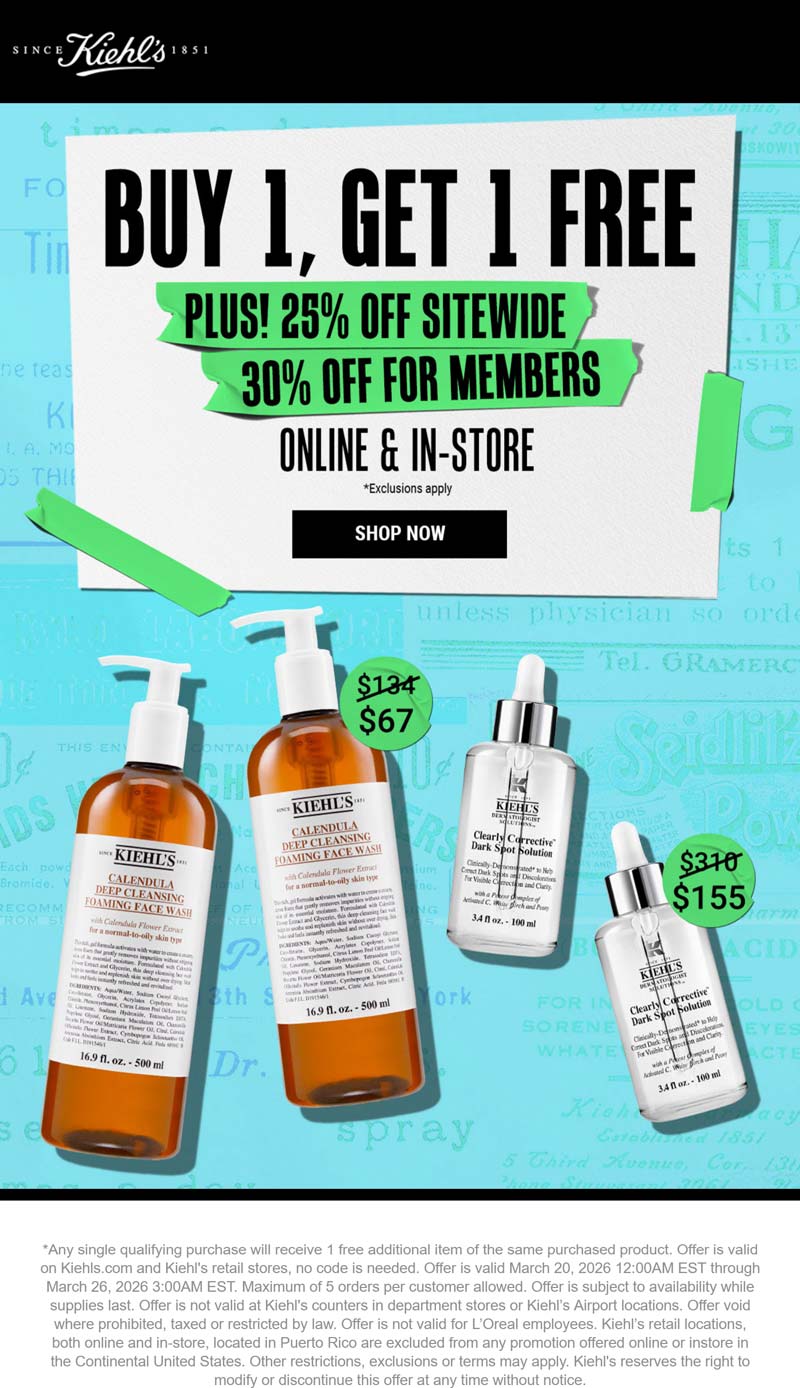 Second item free + 25% off everything at Kiehls, ditto online