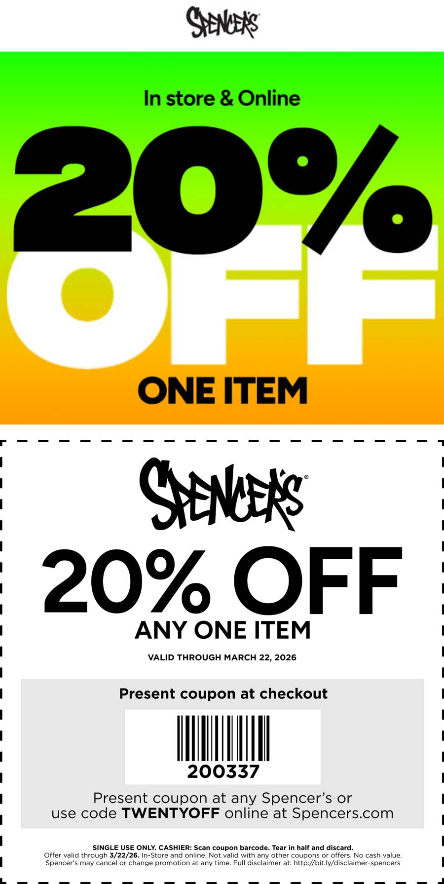 20% off a single item today at Spencers, or online via promo code TWENTYOFF