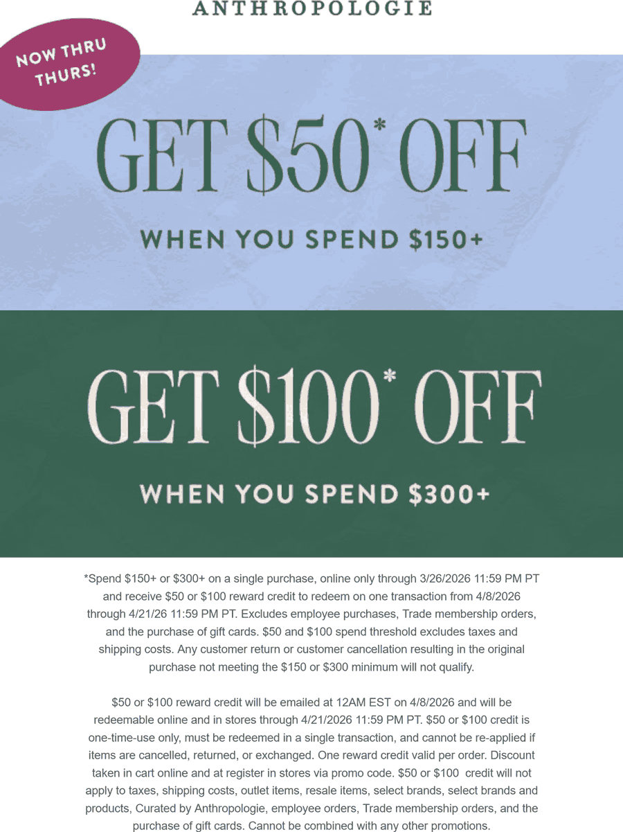 $50-$100 off $150+ at Anthropologie
